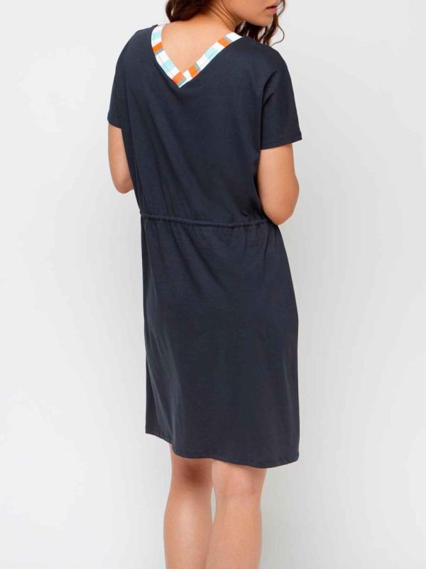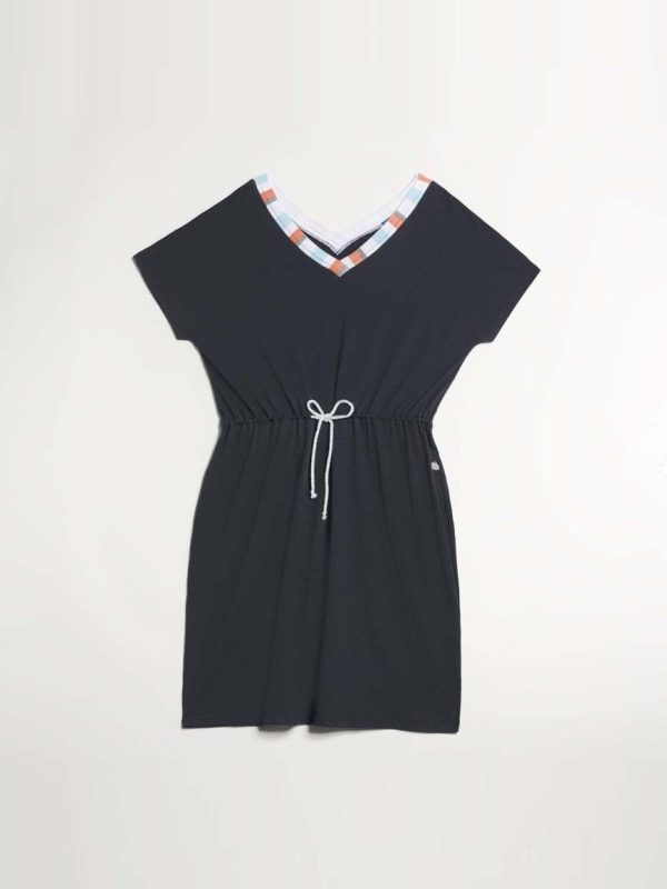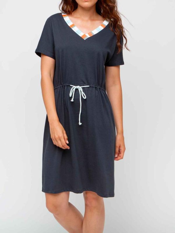 En coton biologique, cette robe marine aux détails féminins se veut confortable et décontractée. Un cordon de serrage pour mettre en valeur votre taille et un col V coloré pour la bonne mine !