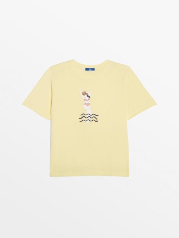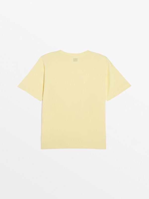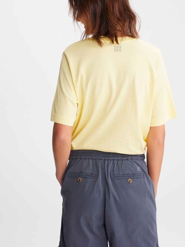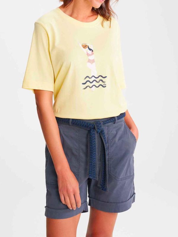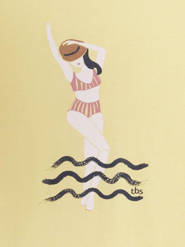 Nouvelle forme de t-shirt en coton biologique en manches montées, les manches sont un peu plus longues et dans un volume droit. Un print exclusif original et coloré pour créer des looks saisonniers.